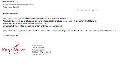 Liebe Piroska. Danke für dein Mail und vor allem: herzlichen Dank für das wunderbare Meister-, Kunst- und Feuerwerk!! Gestern Abend konnte ich mir endlich mal Zeit nehmen, das Abenteuer-Buch so richtig durchzuschmökern, die verschiedensten Materialien und Überraschungen zu ertasten und die zahlreichen Sprüche, Zitate, etc. durch den Kopf gehen zu lassen. Als Fazit bleibt mir nur, dir herzlich zu gratulieren für diese unglaublich kreative Arbeit, die du, sprühend vor Ideen, Visionen und positiver Willensstärke, vollbracht hast! Wow! Gleichzeitig danke ich dir, dass du dich überhaupt an ein solches Projekt heranwagst und dass du uns als Partner miteinbezogen hast – wir freuen uns sehr über das Endresultat und sind stolz darauf, mitgewirkt zu haben! Ich freue mich jetzt schon auf alles weitere und wünsche dir weiterhin viel Erfolg und Freude mit deinem Kochkunstbuch! Herzlicher Gruss, Christian